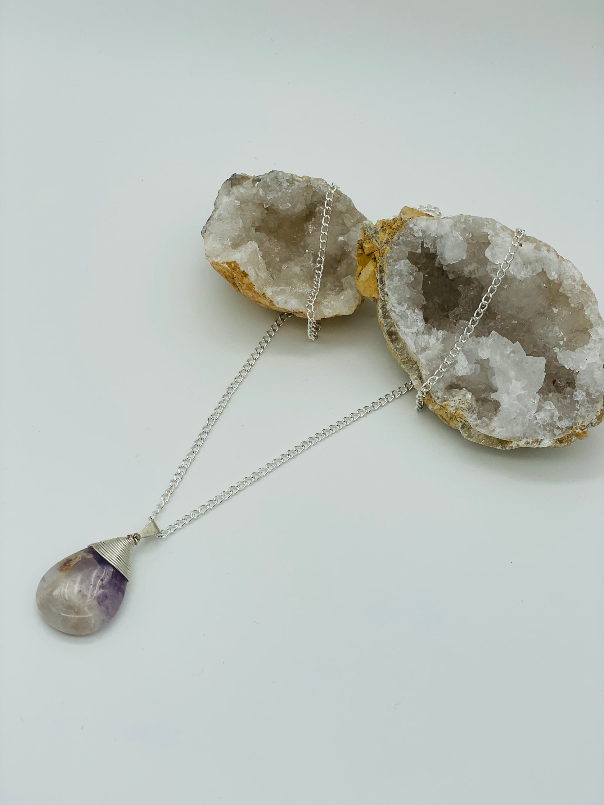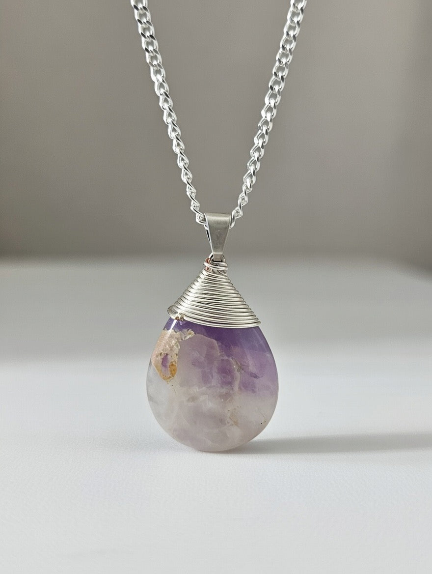 Una pieza única que combina la belleza natural de un cabujón de amatista con la delicada técnica artesanal del alambrismo. Este collar presenta una gema de amatista cuidadosamente engarzada con alambre de acero inoxidable, creando un diseño orgánico y elegante que realza la energía espiritual de esta piedra semipreciosa.