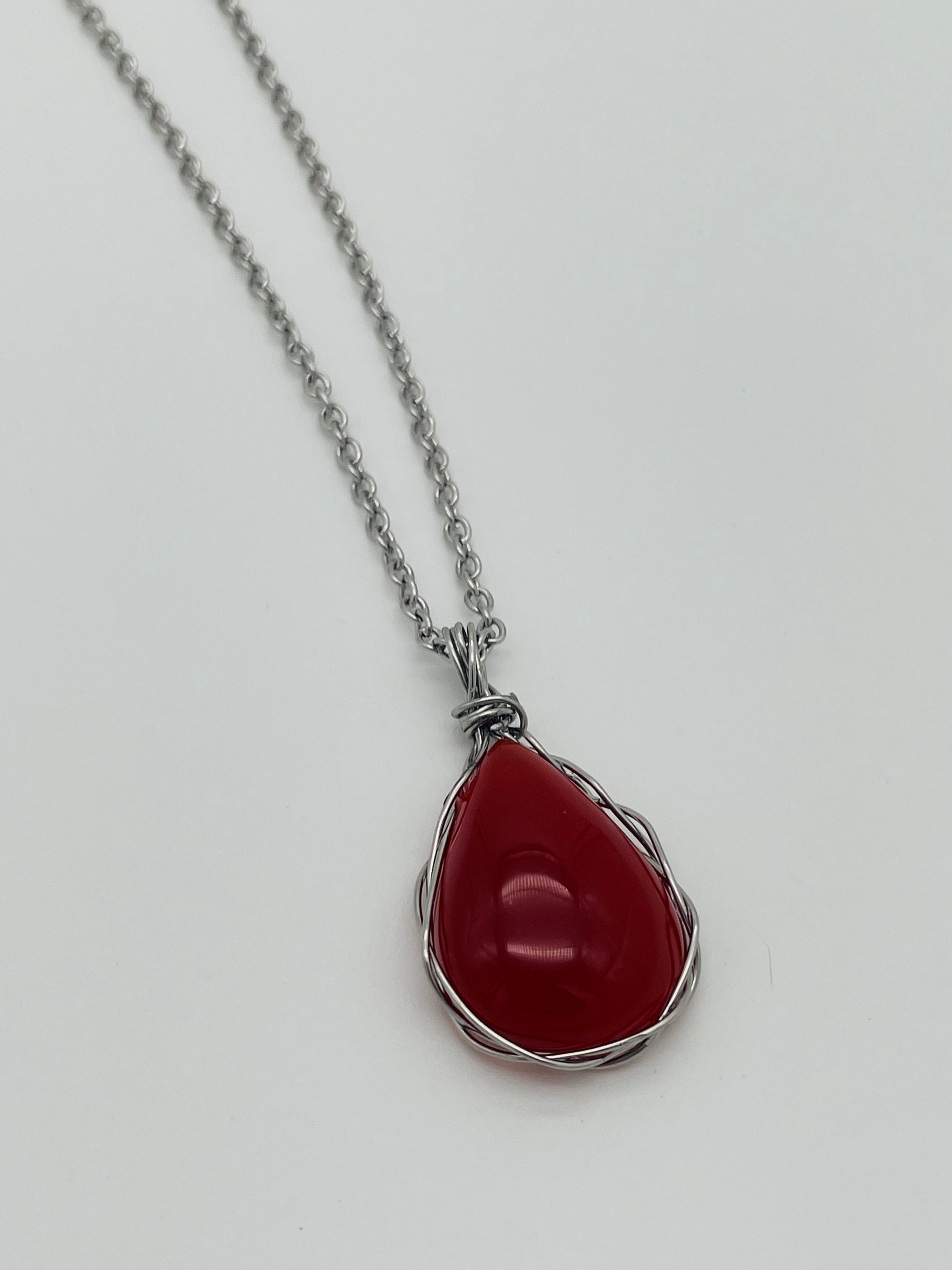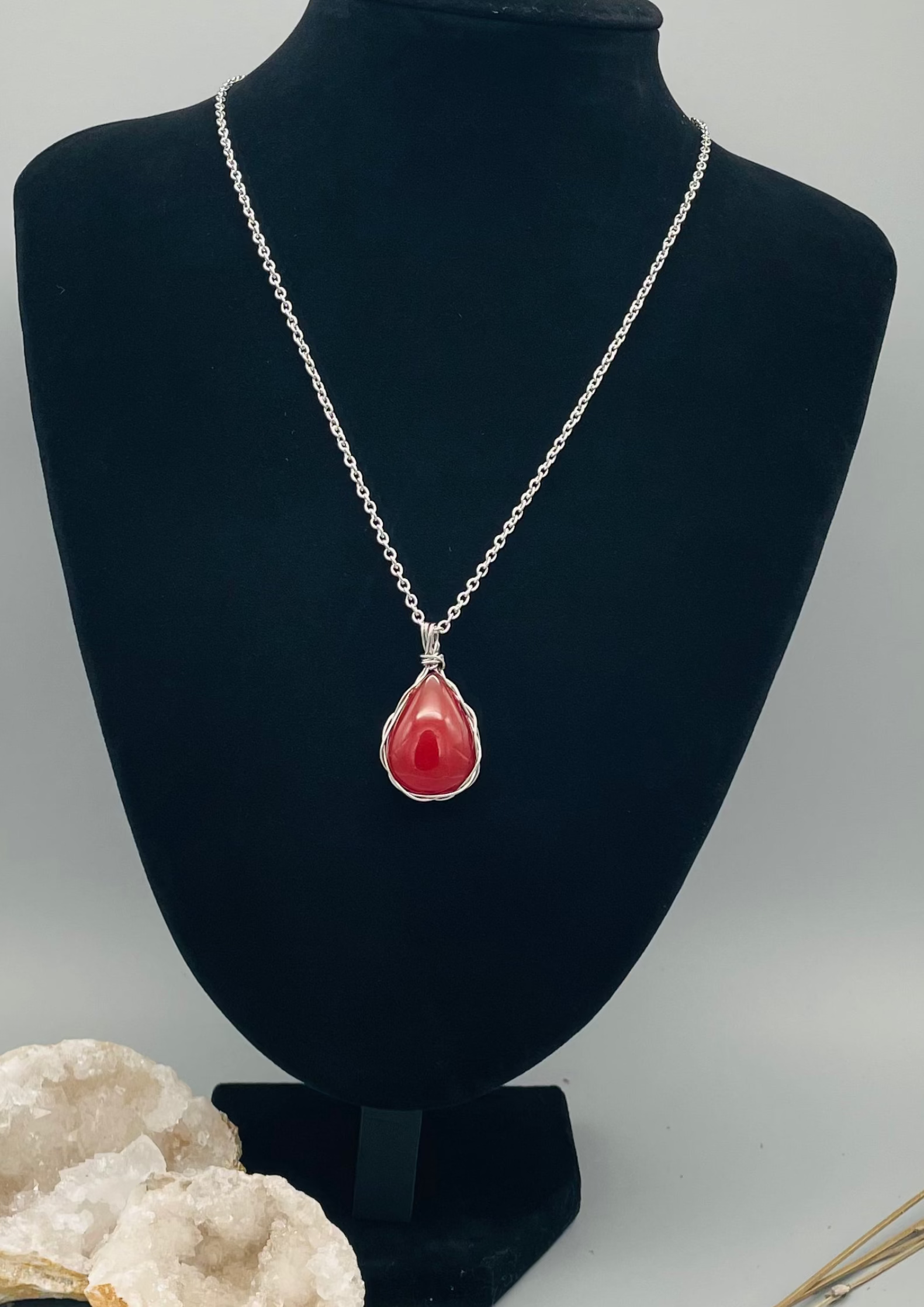 Una pieza excepcional que combina la energía vibrante de un cabujón de cornalina con el delicado tejido de alambrismo en acero inoxidable. Este collar presenta una gema de cornalina cuidadosamente enmarcada con un intrincado trabajo de alambre, creando un diseño único que realza los tonos cálidos naranjas y rojizos de esta piedra semipreciosa.