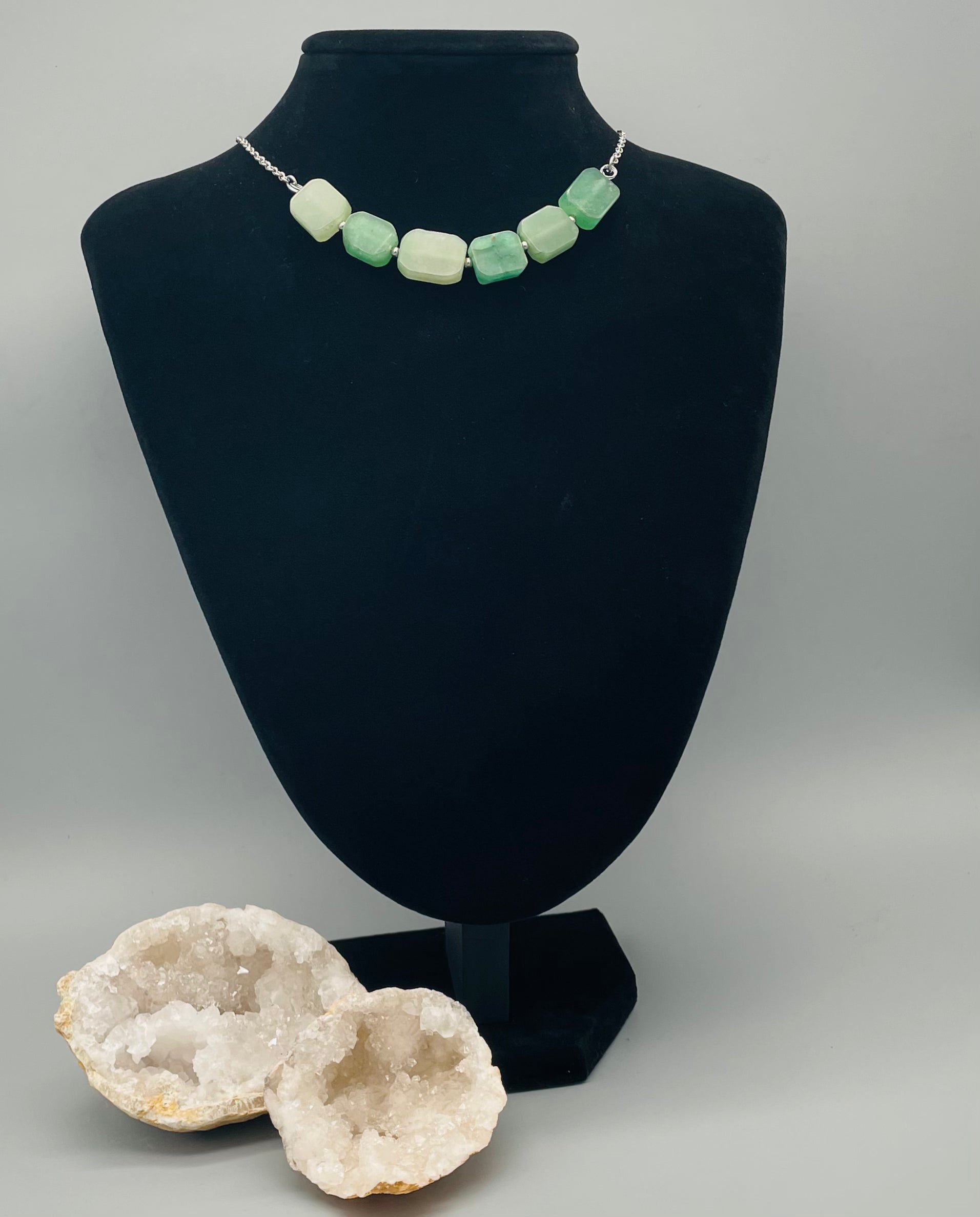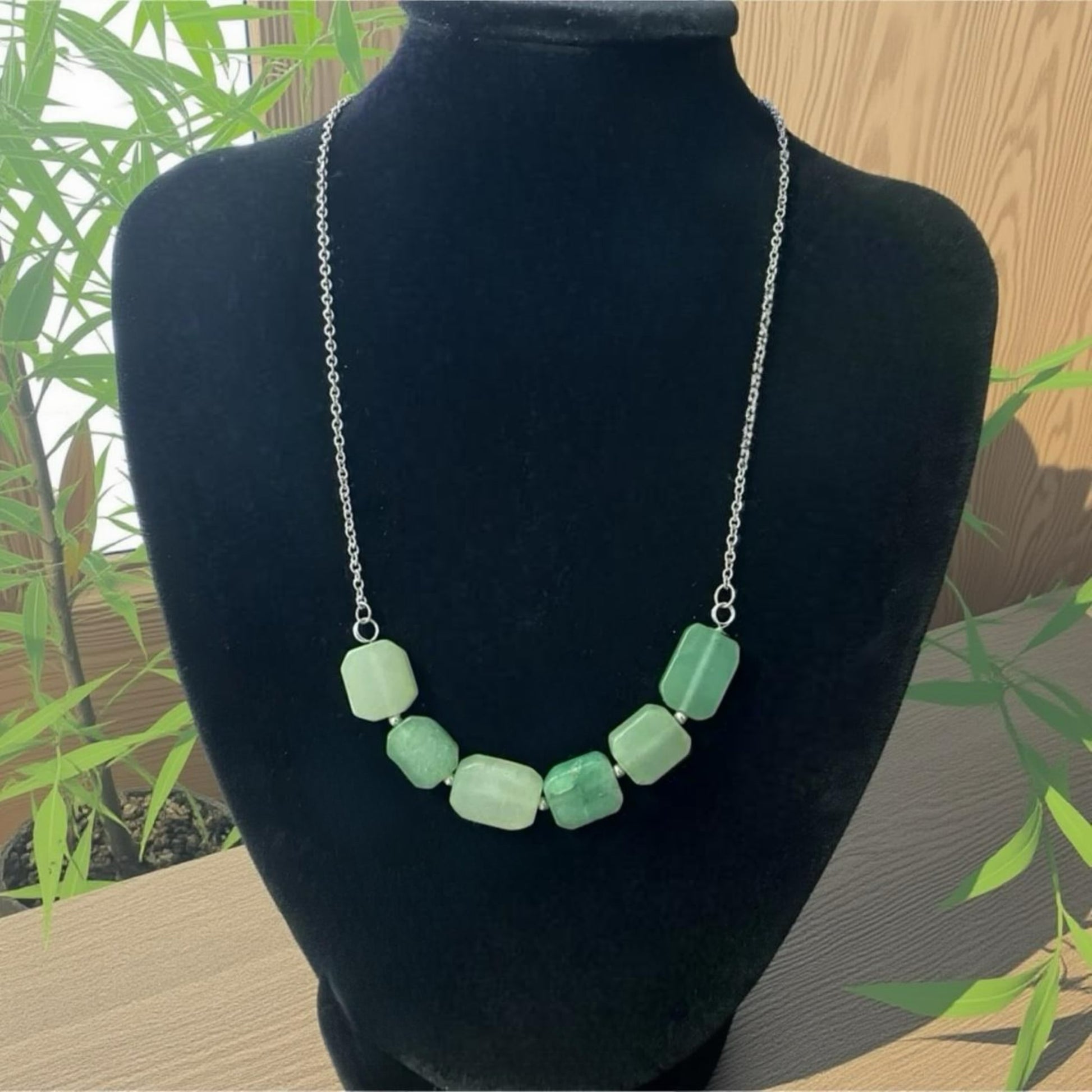 Descubre la energía de la aventurina, la piedra de la prosperidad y la buena fortuna. Este elegante collar combina 6 gemas de aventurina de forma cuadrada con acero inoxidable de alta calidad, creando una pieza única que fusiona estilo contemporáneo con las propiedades naturales de esta piedra semipreciosa.
