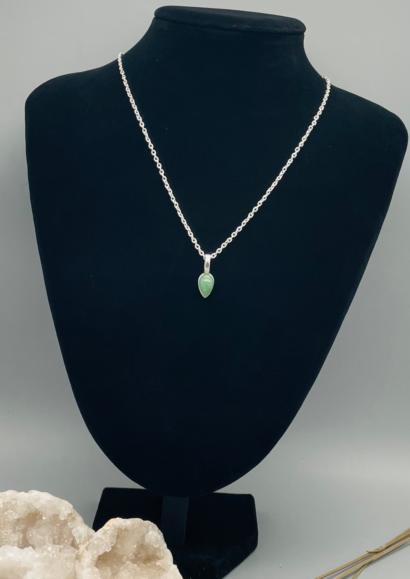 Hermoso collar de aventurina natural de 50 cm de longitud, con cadena de acero inoxidable de alta calidad y engarce en aleación de plata tibetana. La aventurina es conocida por sus propiedades calmantes y equilibrantes según Santa Hildegarda.