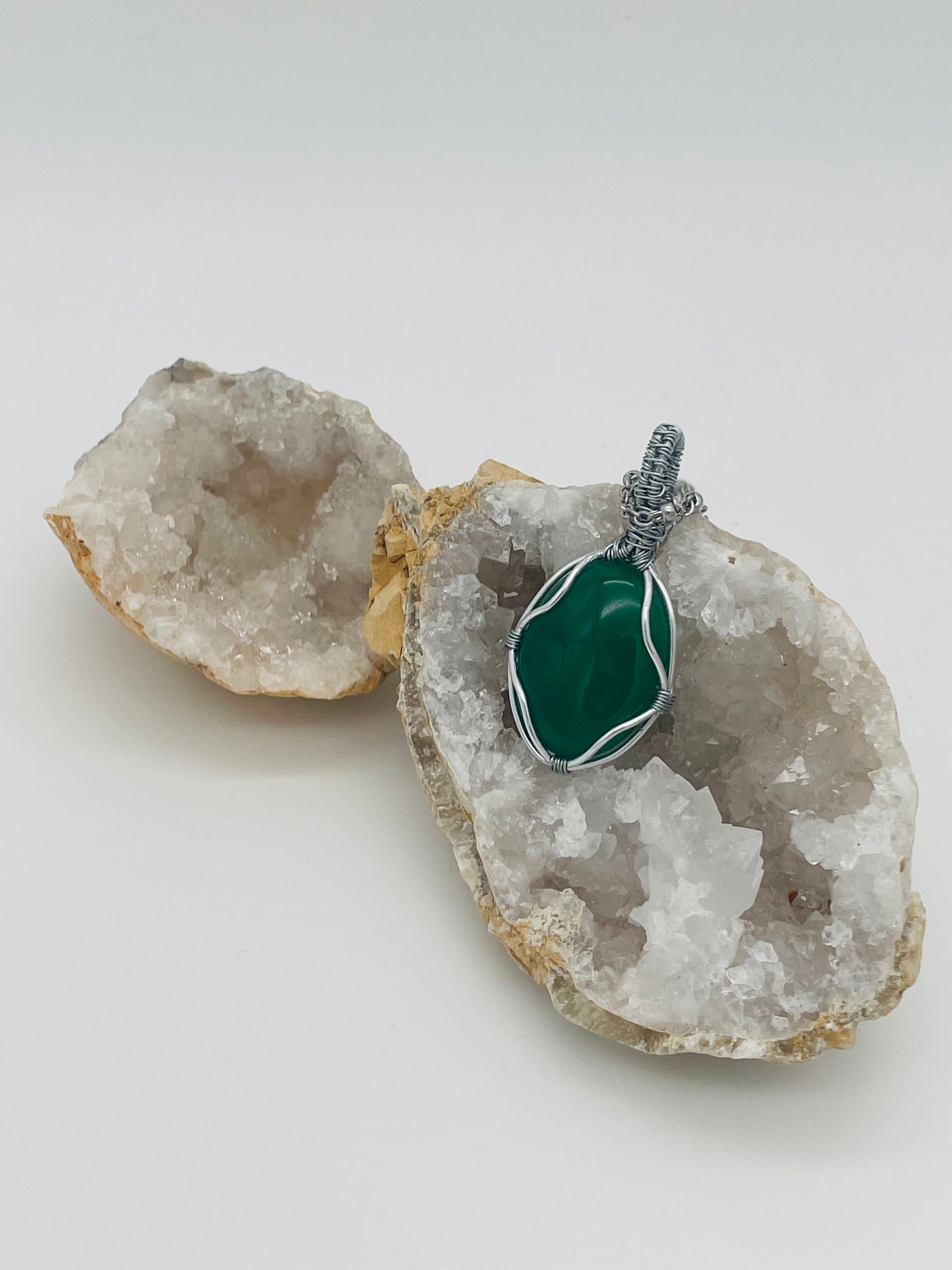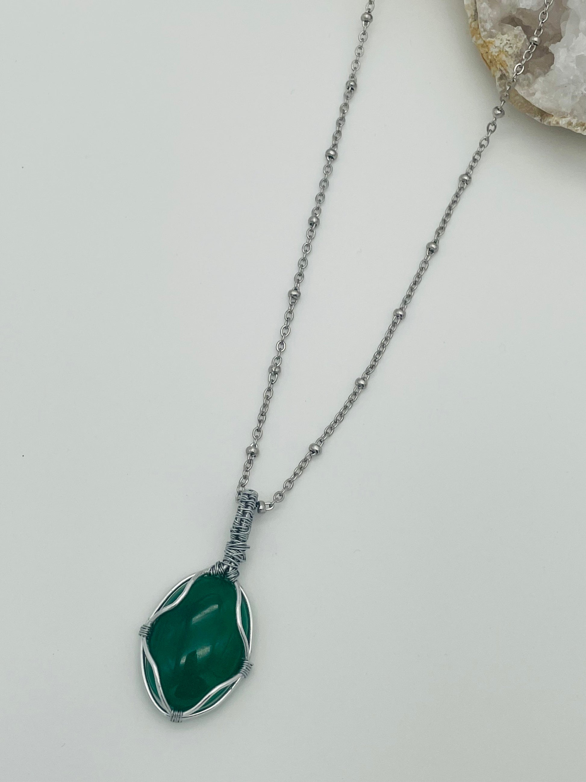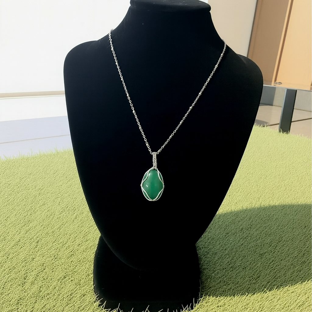 Collar artesanal único que combina la belleza de la aventurina natural en cabujón con la delicada técnica del alambrismo, suspendido en una elegante cadena satélite plateada.