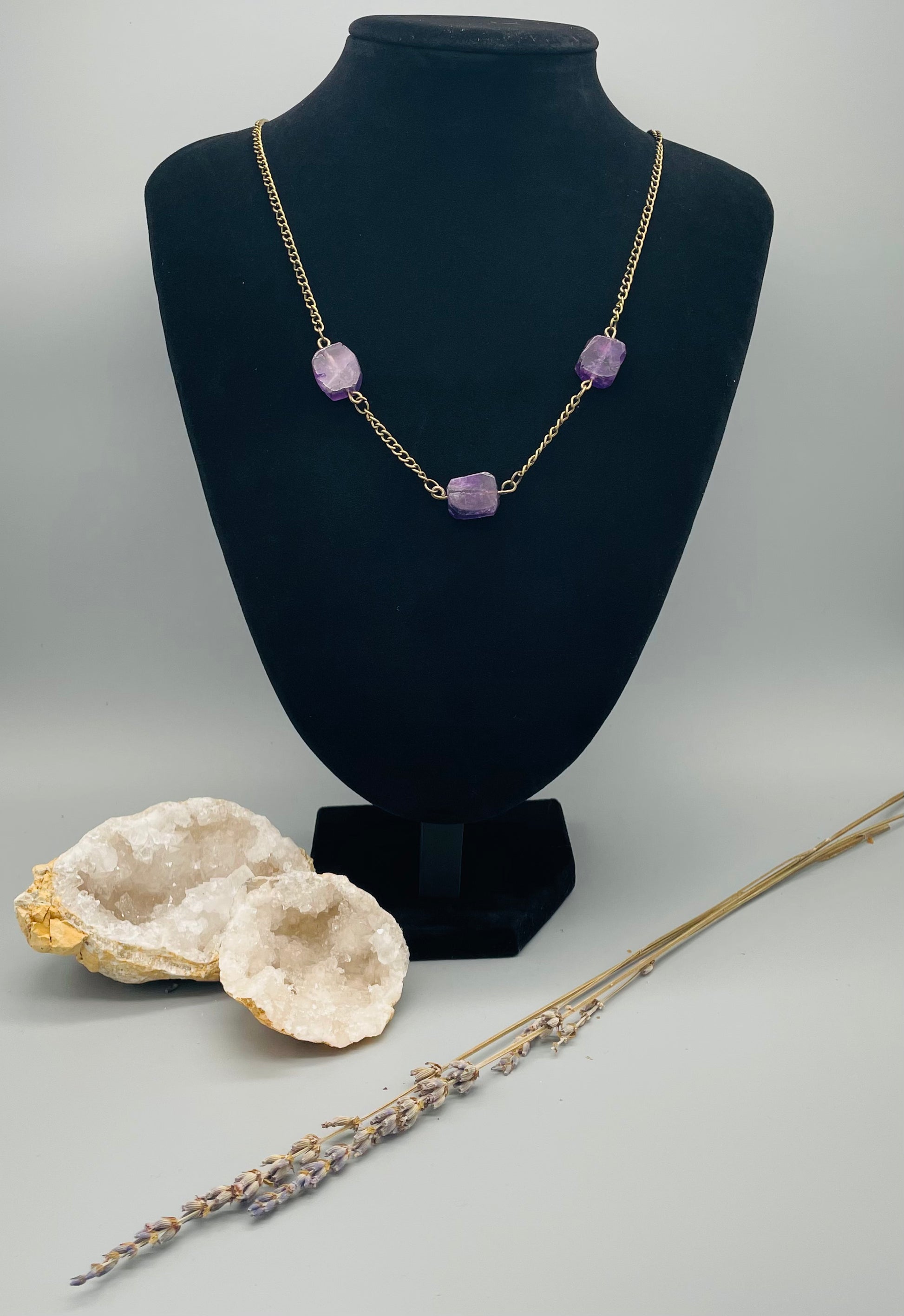 Collar artesanal de bronce que destaca tres piedras de amatista natural pulida, creando un diseño elegante y equilibrado en una cadena de 60cm de longitud.