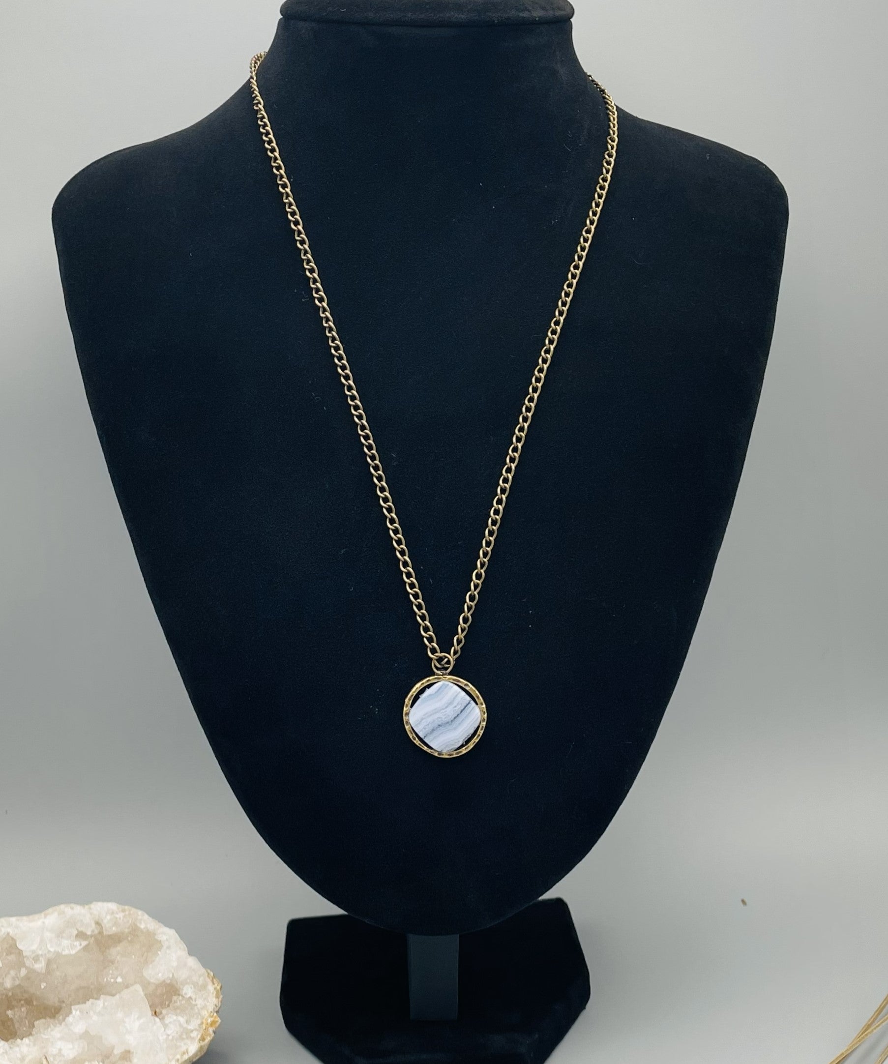 Una pieza única que combina la suave energía de la calcedonia con el carácter rústico del bronce martillado. Este collar presenta una gema de calcedonia cuidadosamente enmarcada en un círculo de bronce trabajado a mano con técnica de martillado, creando un diseño orgánico que realza los tonos translúcidos y serenos de esta piedra semipreciosa.