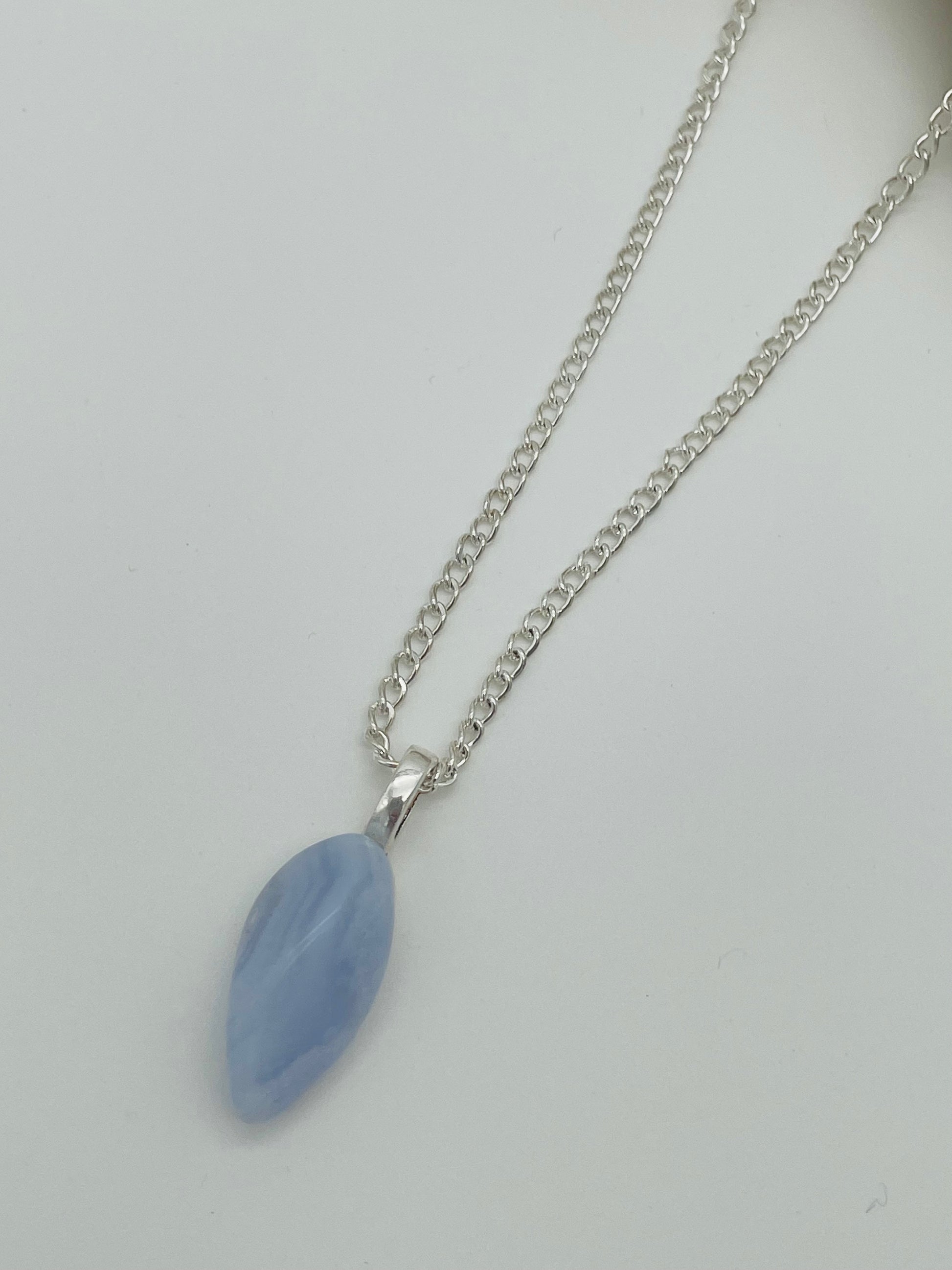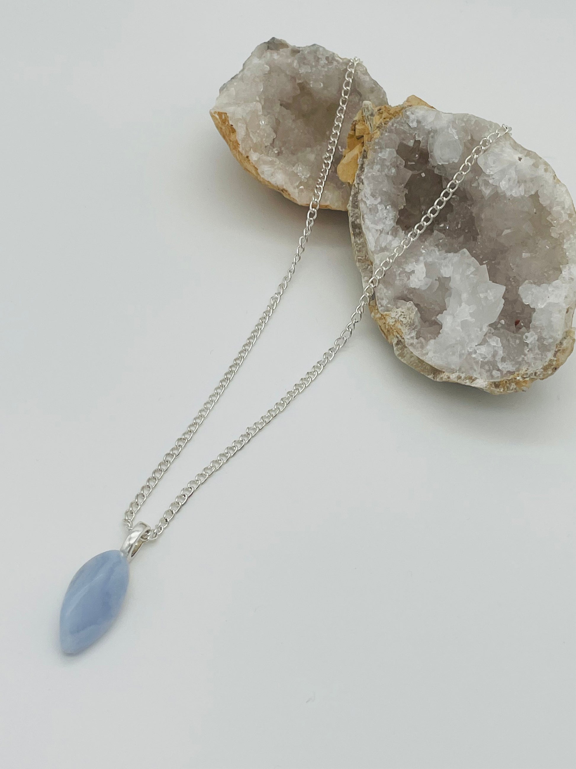Esta piedra de Calcedonia natural en bruto, sin pulir, conserva su textura y forma única, creando una pieza auténtica y llena de carácter. Suspendida en una delicada cadena plateada de acero inoxidable de 50 cm con un elegante gancho de aleación de plata tibetana, este collar combina la belleza natural de la gema con un acabado impecable.