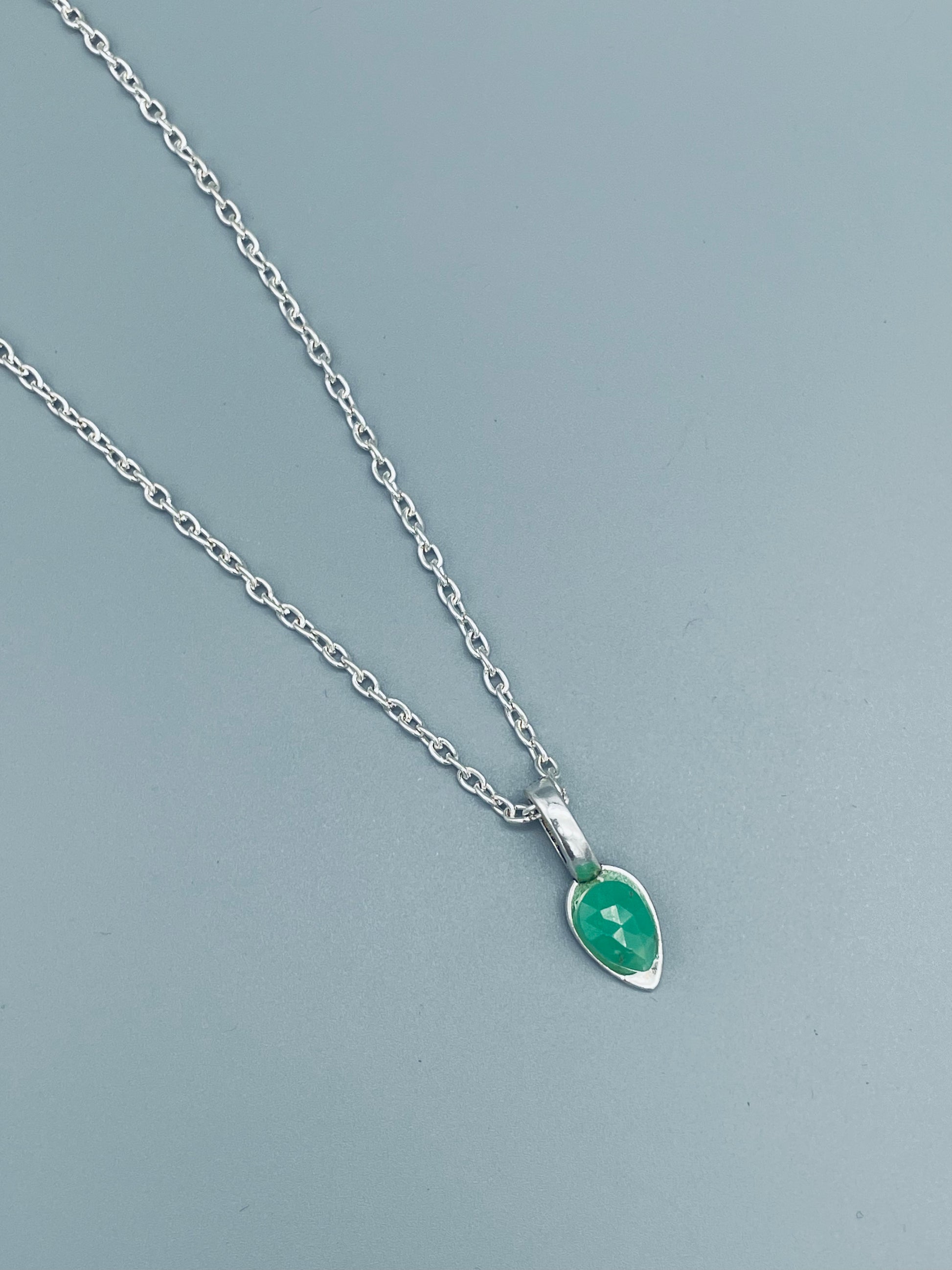 Elegante collar de crisoprasa natural de 50 cm de longitud, con cadena de acero inoxidable de alta calidad y engarce en aleación de plata tibetana. La crisoprasa es conocida por sus propiedades calmantes y revitalizantes según Santa Hildegarda.