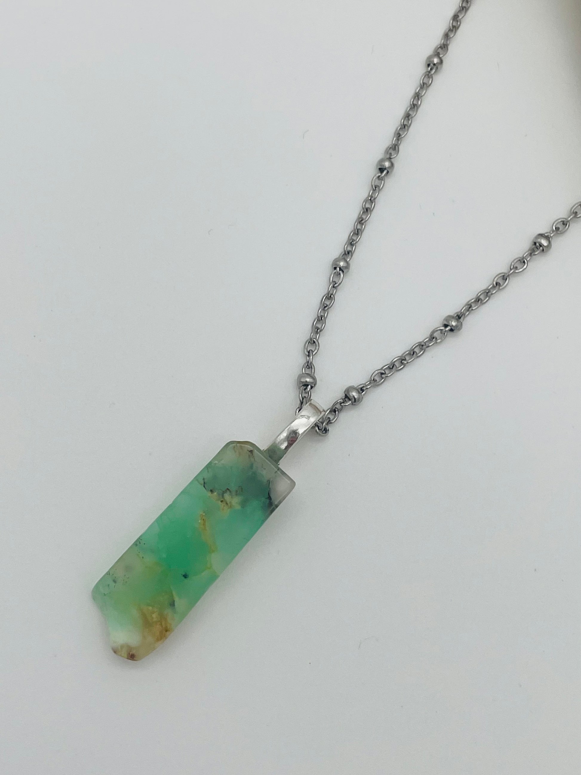 Crisoprasa Pulida en Collar de con Cadena Satélite Plateada - 55cm Acero Inoxidable
