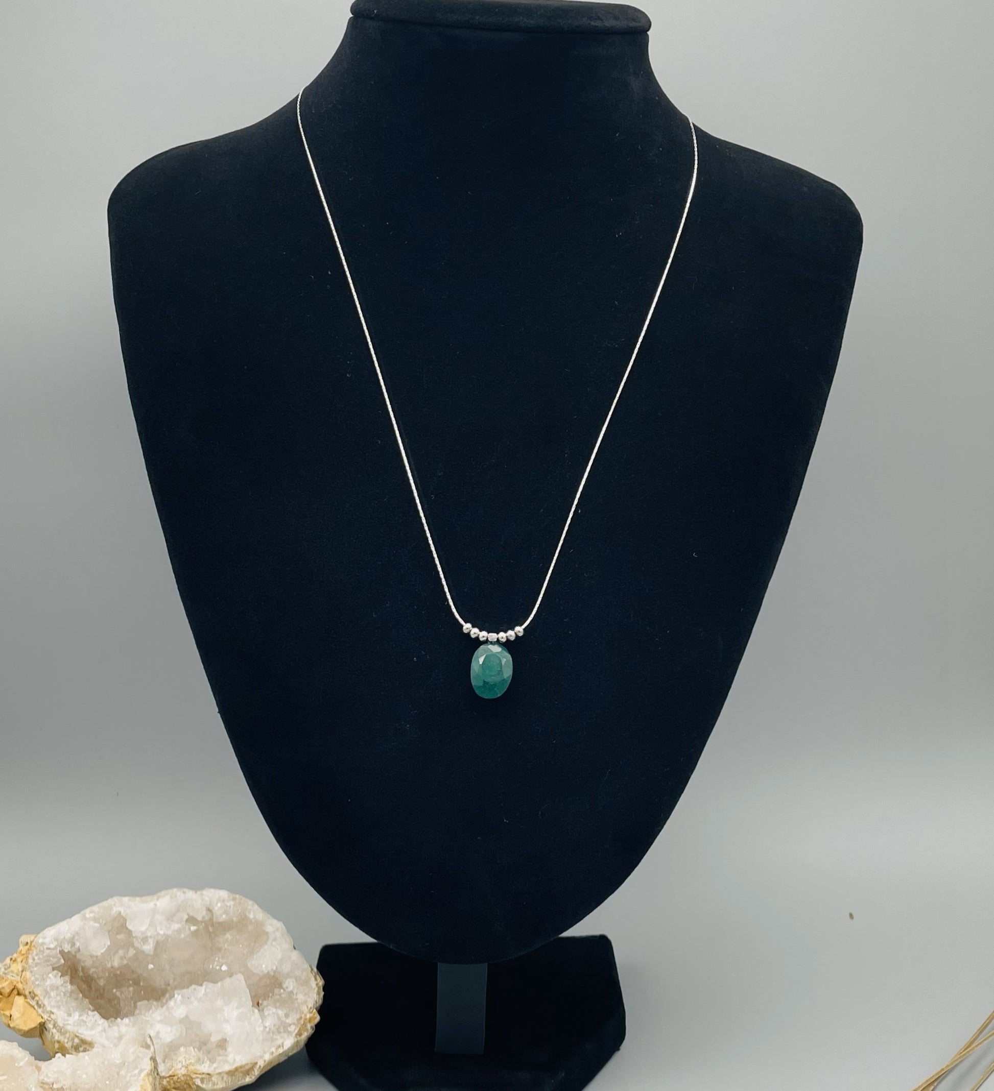Collar elegante de esmeralda natural, una de las gemas preciosas más valoradas, suspendida en una delicada cadena plateada de acero inoxidable.
