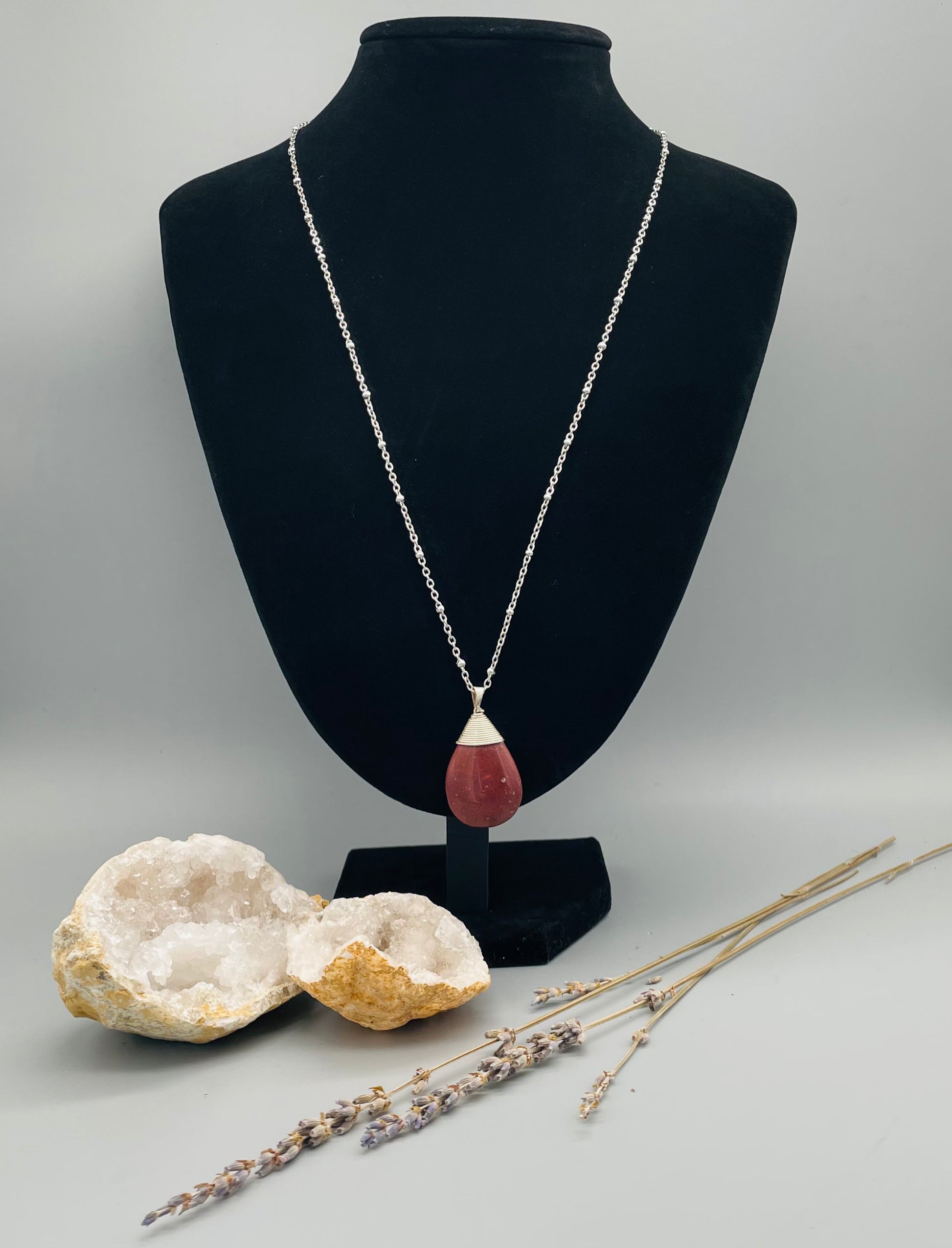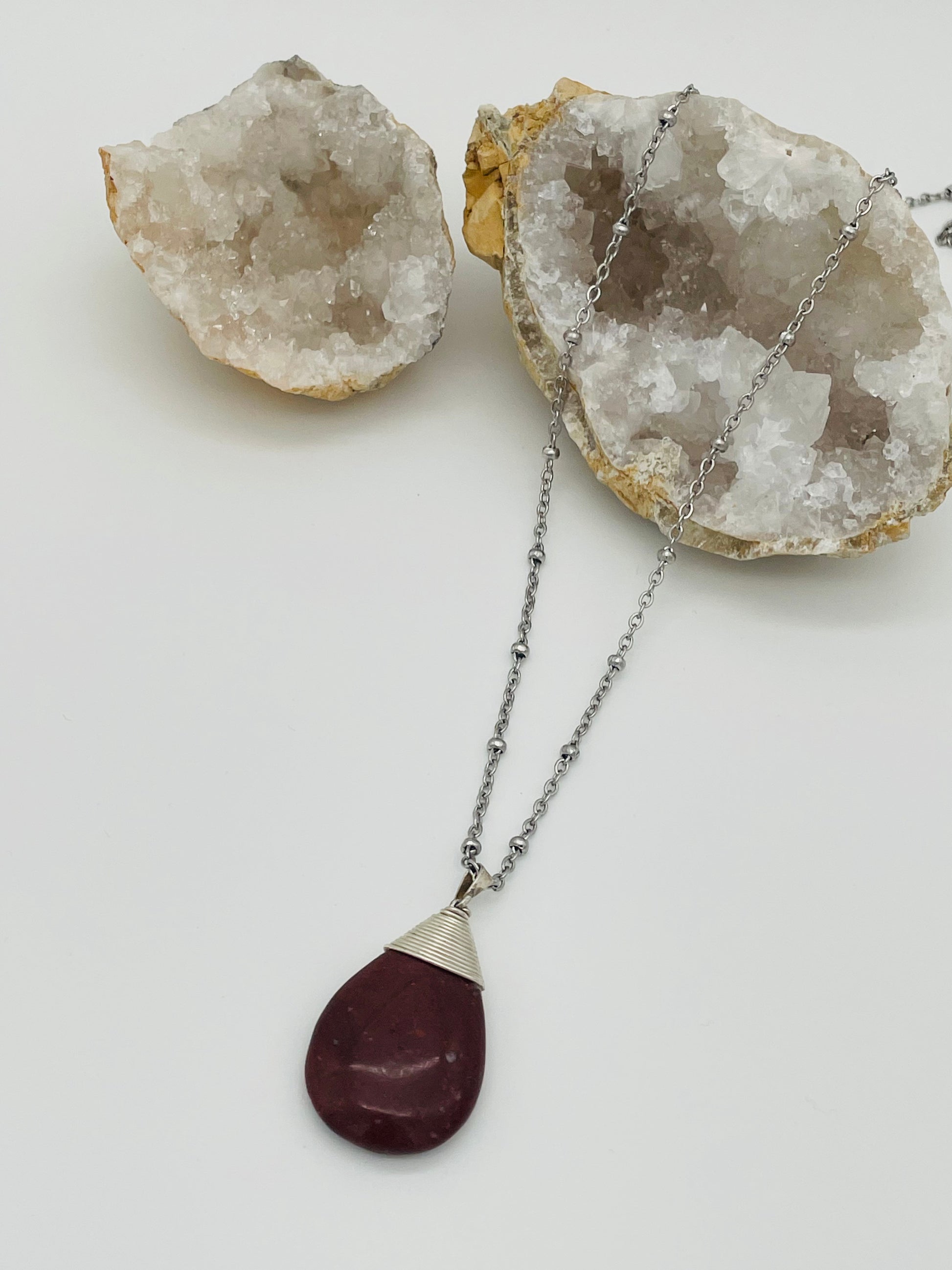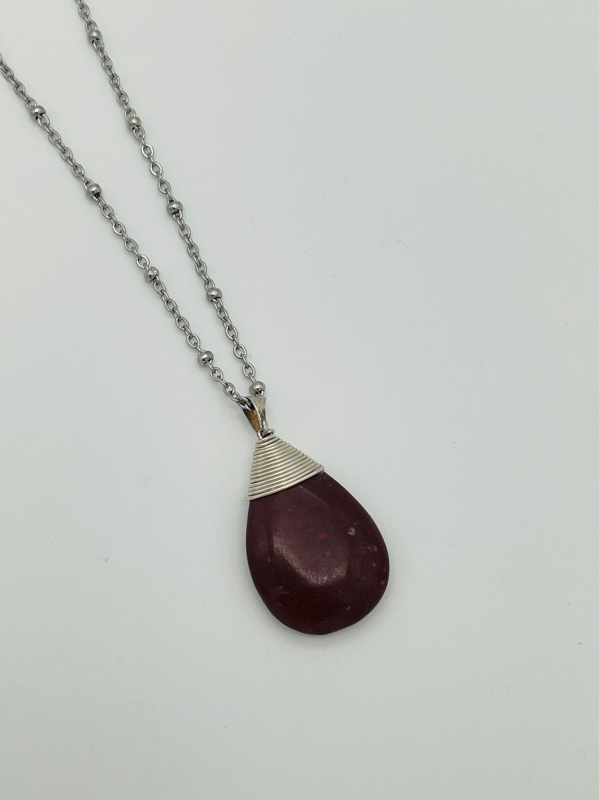 Collar artesanal de jaspe rojo natural engarzado con la delicada técnica del alambrismo, suspendido en una elegante cadena satélite plateada de acero inoxidable.