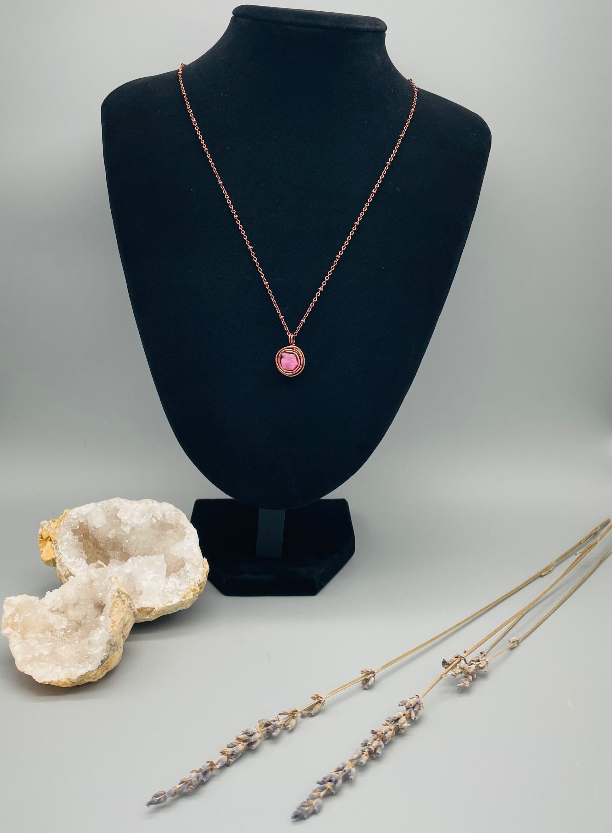 Una pieza excepcional que combina la pasión y energía del rubí corindón, enrollado delicadamente con técnica de alambrismo en bronce. Este collar presenta una gema de rubí corindón natural engarzada con hilo de bronce y suspendida de una elegante cadena tipo satélite, creando un diseño sofisticado que captura los intensos tonos rojos de esta piedra preciosa.