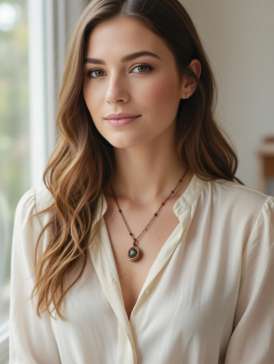 El olivino es conocido por su energía revitalizante y protectora, mientras que el trabajo artesanal en bronce le da un carácter atemporal. Esta pieza combina a la perfección con looks casuales y ocasiones especiales.