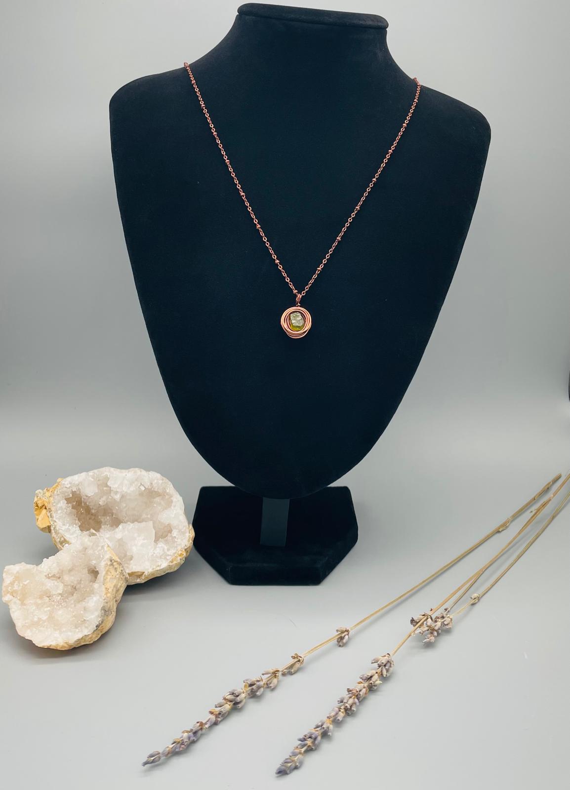 Descubre la belleza natural de este collar artesanal único, donde el bronce envejecido abraza delicadamente una piedra de olivino (peridoto) verde.