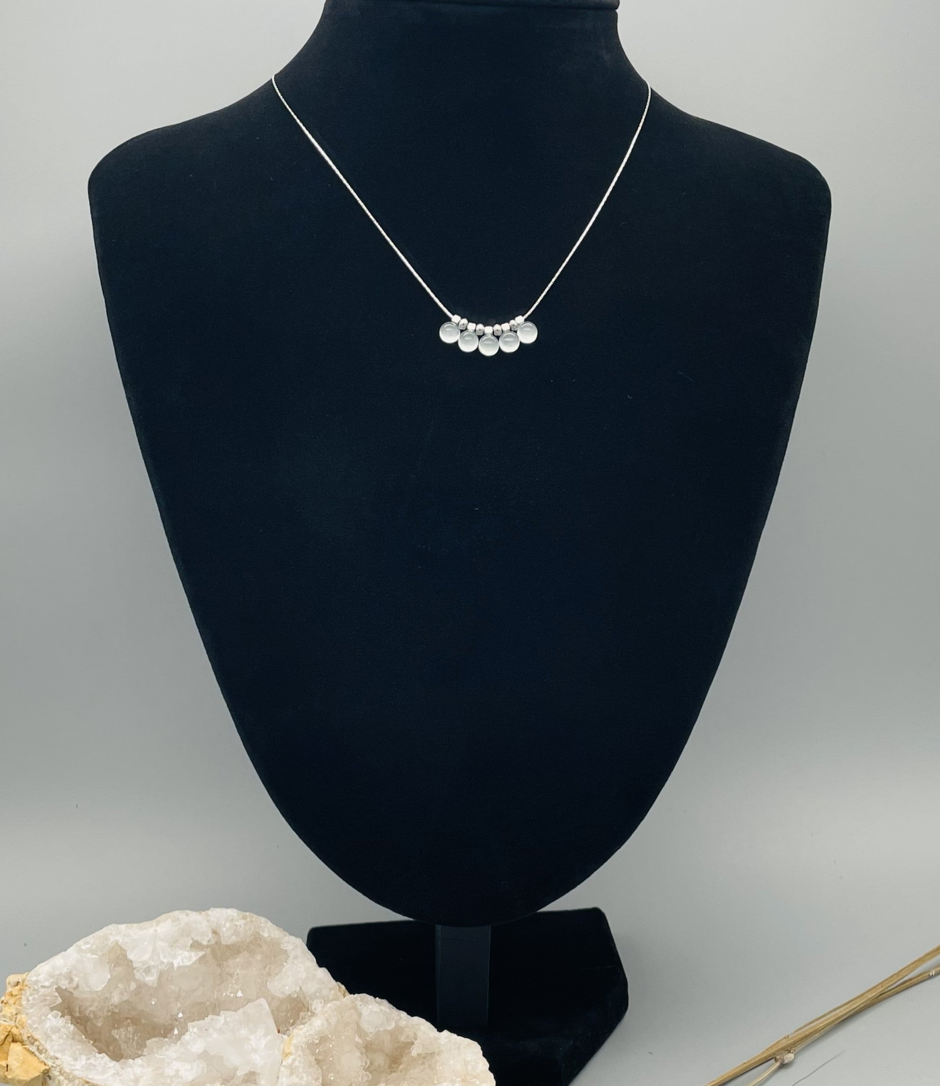 Gargantilla delicada de aguamarina con 5 cabujones pequeños de 2 mm que capturan la esencia sutil del mar. La aguamarina, conocida por su conexión con la calma, la claridad y la comunicación, se presenta en un diseño minimalista de 45 cm de longitud, perfecto para llevar solo o en capas.
